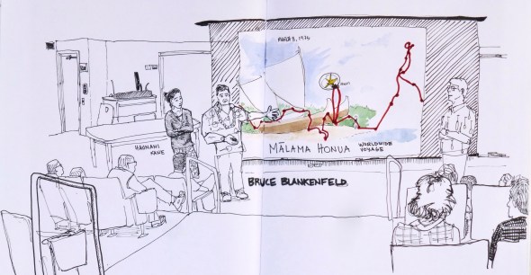 A few weeks prior, I also attended a presentation at the University of Hawaiʻi at Mānoa about the Mālama Honua Worldwide Voyage given by master navigator Bruce Blankenfeld and crew member Haunani Kane.