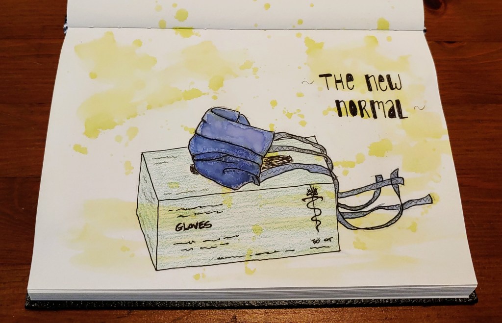 I noticed our small box of gloves and one of our fabric masks waiting for use near our front door, and felt compelled to sketch them.  They represent a little snapshot in the enormous scope of this pandemic.  Watercolor, pen and colored pencils all played a part in the sketch.