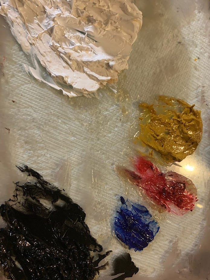 For my palette, I’m using titanium white, yellow ochre, alizarin crimson, ultramarine blue, and ivory black. The medium I’m using is Liquin, which I’ve found works best for me so far. It has a strange gel like quality and the more you play with it, the more it flows. I also have containers of Gamsol on hand as solvent/brush cleaner. While they are still flammable and should not be ingested, these chemicals are safer than some of the other medium and solvents used in oil painting. Linseed oil should be used with caution as it can cause rags to spontaneously combust and turpentine is highly toxic.