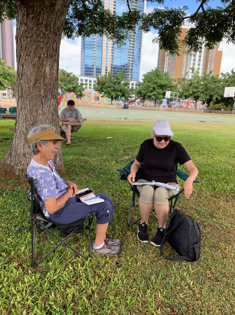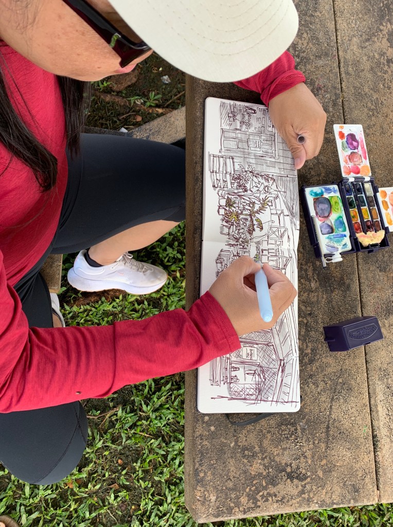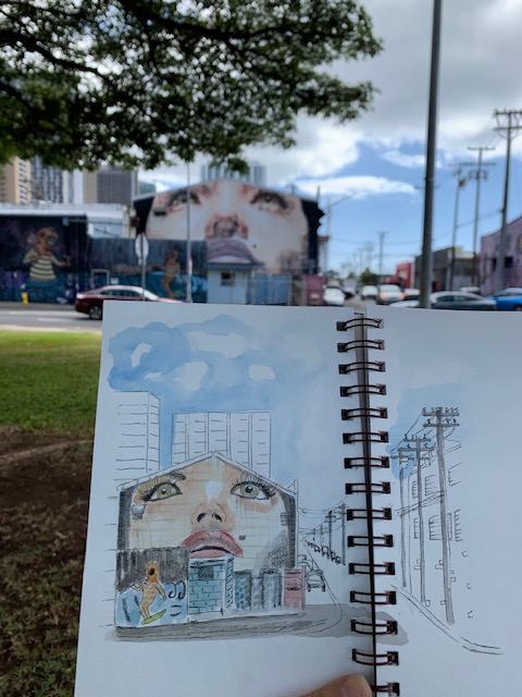 We spent this morning appreciating architecture and art at Mother Waldron Playground in Kaka’ako. Kaka’ako is such a vibrant community in the heart of urban Honolulu. The streets are full of colorful murals covering nearly every wall you see. It is an inspiring place and as Urban Sketchers, you have to appreciate city art, the unique architecture, and the artist vibe of Kaka’ako.
