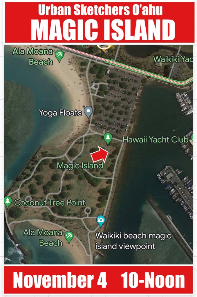 We’ll be meeting at 10am to sketch the harbor, Diamond Head view, Waikiki, beach goers, and other Saturday activity at Magic Island. There are a lot of trees for shade. Free parking. Option to bring a beach chair to be comfortable. Also be sure to bring water to keep hydrated. We’ll share our sketches at 11:30.