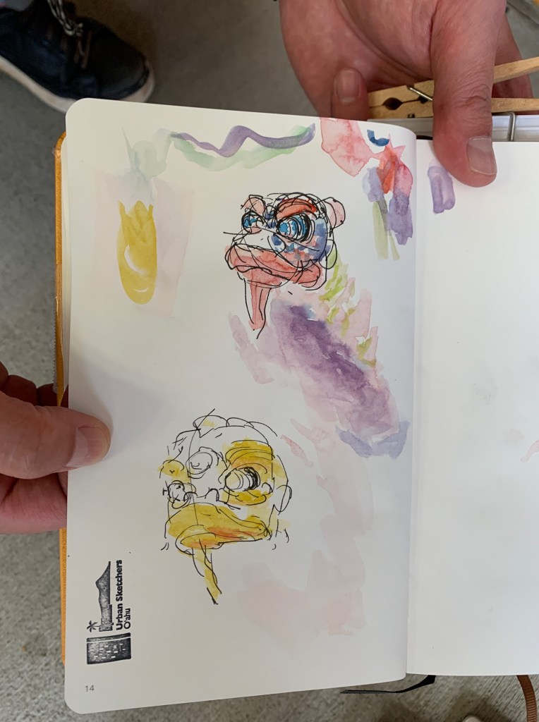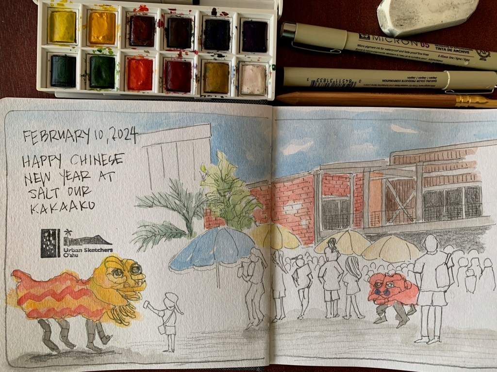 Posted: February 10, 2024 Filed under: USkO 1 CommentDespite the large crowds, loud drums, and colorful lion dances, we did manage to sketch at the Lunar New Year celebration at SALT our Kaka’ako.