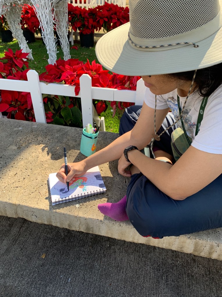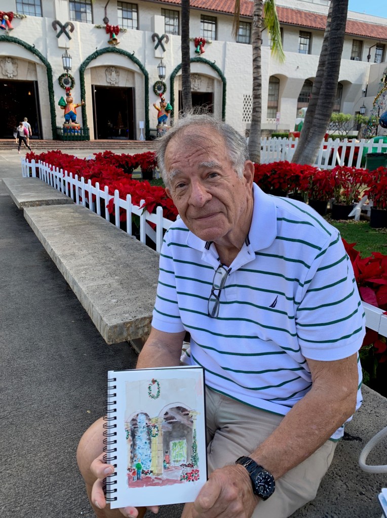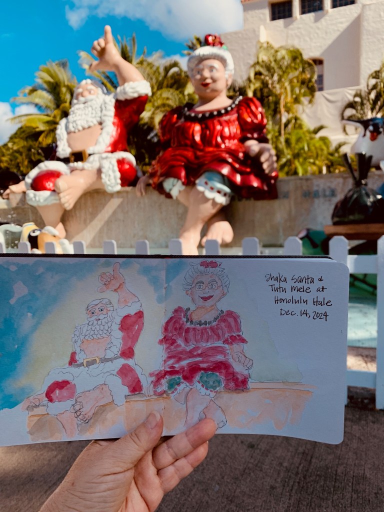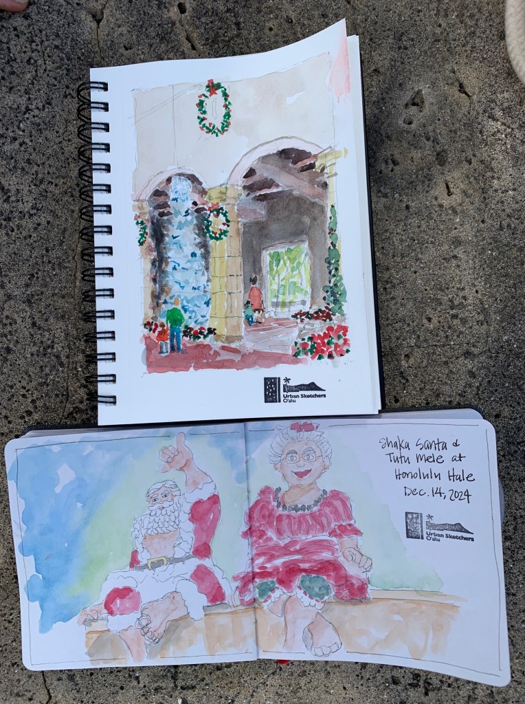 Maybe everyone was busy. Maybe it was traffic. But it was three of us sketching at Honolulu Hale this morning. Thank you to Nia and George who spent part of their morning sketching the merriment at Honolulu Hale.