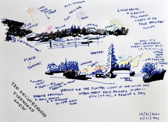 In keeping with tradition, I sketched fireworks in my neighborhood on New Year’s Eve. I actually found myself in a spot where I felt like I was surrounded by fireworks. In the dark (and without a flashlight in order to preserve my night vision), I doodled with two basic Pilot gel pens and a Sharpie marker, adding the fireworks and glow with color pencils in as real time as possible – along with a little on-page narrative.