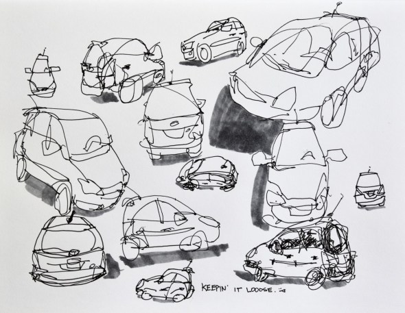 Posted: January 15, 2021 Filed under: USkO | Tags: automobiles, car, cars, manual transmission, stick shift 7 CommentsThis past week, I sketched my car, just outside of my apartment. Cars are fun to draw – their features give them such personality. For my first sketch, I spent a good amount of time trying to get the proportions right – which worked out for the most part. Then, sitting in the driver’s seat for the second sketch, I adopted a slightly looser style, quickly eyeballing the layout of the interior. I took a few wrong turns though – whoops! I will have to return to this subject in the future. As I sketched my car, I was reminded of Florian Afflerbach’s amazing artwork. After seeing his drawings years ago, I was inspired to try some extreme close-up perspectives too … in my own way. His clean, architectural style is elusive to me. The cars I draw suddenly develop dents, scrapes, and misattached or misaligned parts. Sure is fun though. I filled a third page with some really loose doodles of my car from all sides.