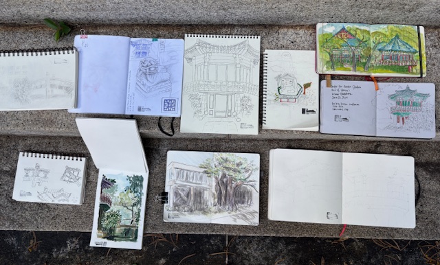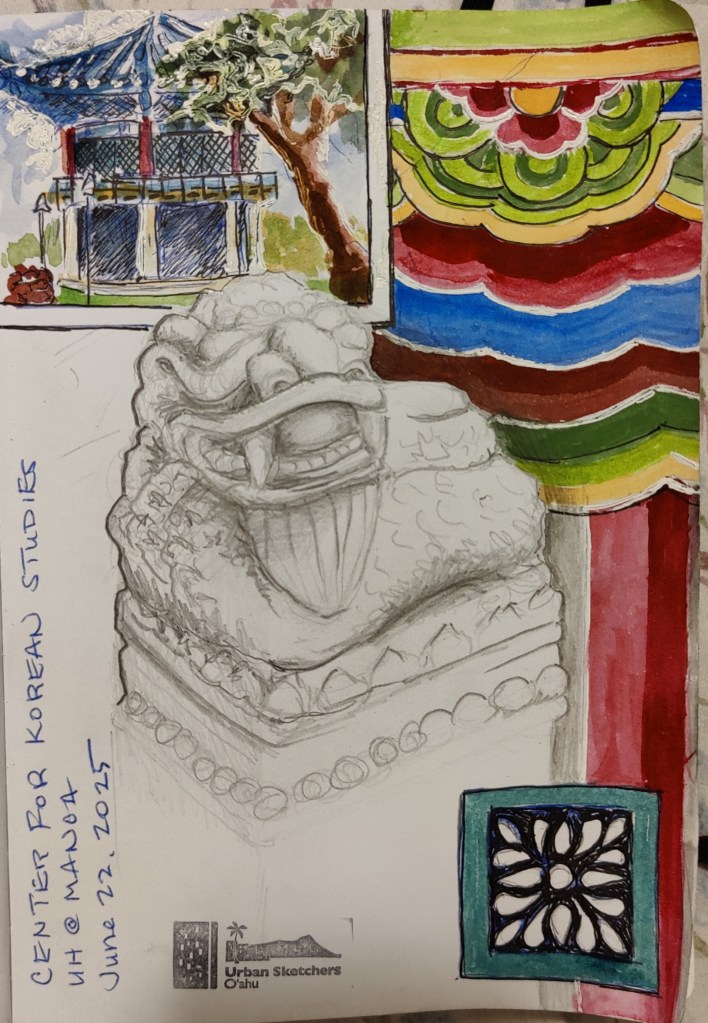 Thank you to everyone who came out today to sketch. Although the Center for Korean Studies building is indeed challenging, it was very fun to capture the colors and details of this cultural, icon architecture.