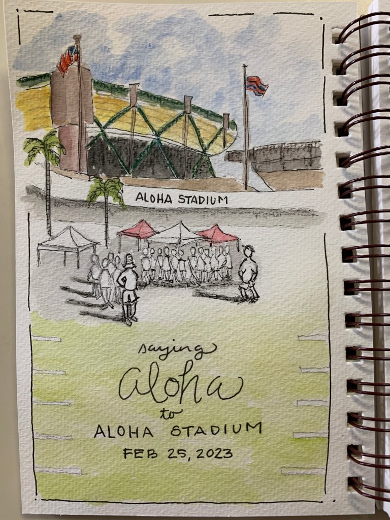 Posted: February 25, 2023 Filed under: USkO 1 CommentSo grateful that Aloha Stadium was open to the public for one last Aloha ‘Oe. Although we didn’t buy orange stadium seats to take home, we did get one last look and the opportunity to sketch Aloha Stadium one last time.