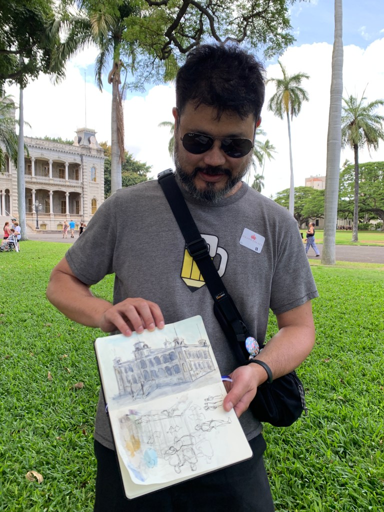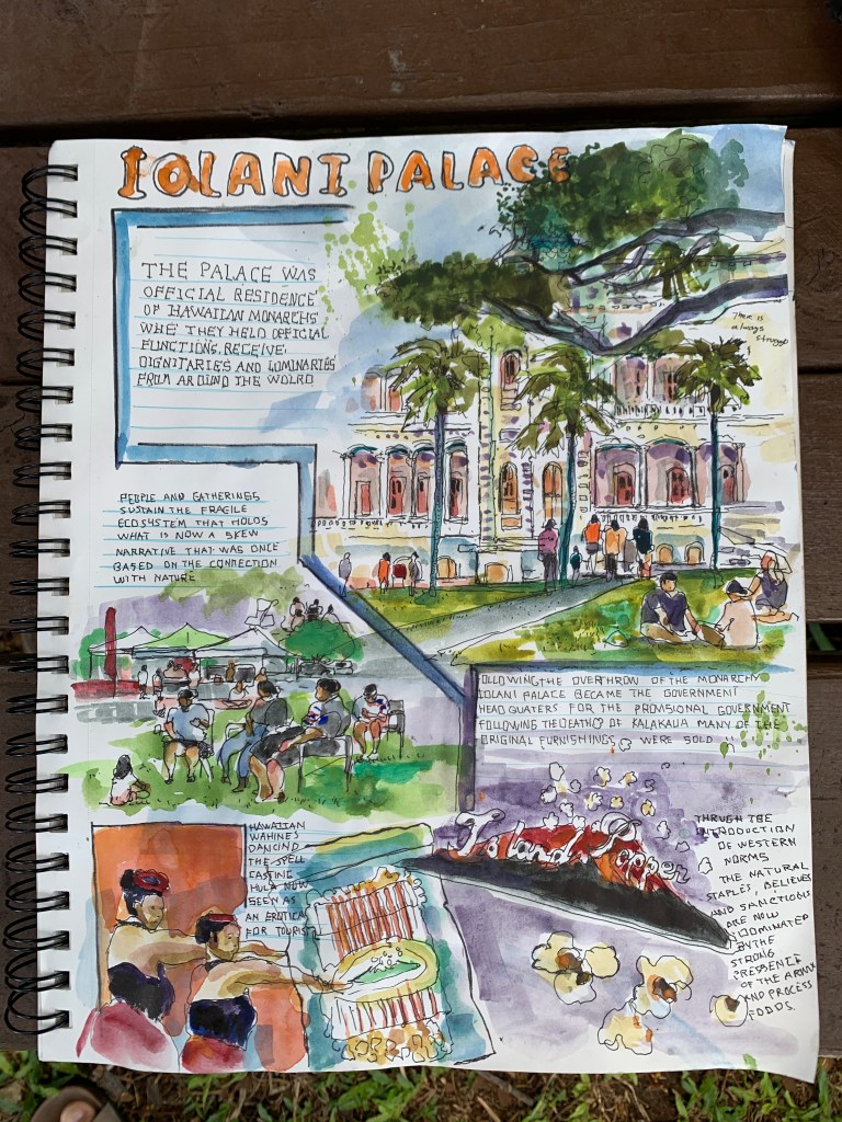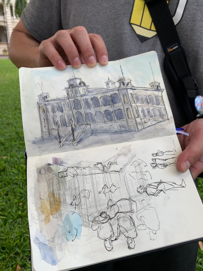 Urban Sketcher Sergio looked at my unfinished sketch and said it best. “You’ll fallen into the seduction of Iolani Palace, trying to capture every detail.” So true.