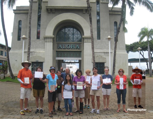As the Urban Sketchers chapter closest to the International Date Line, USk Oʻahu found itself in a privileged position this morning, as we staged the final leg of today’s worldwide sketchwalk in celebration of USk’s 10th anniversary. Although the weather looked less than inviting early in the day, the conditions downtown were actually quite pleasant – overcast and cool, with just the occasional drizzle. Our three-stop sketchwalk offered views of the aging Falls of Clyde (the last remaining iron-hulled four-masted ship), pub life, birds and fish, harbor activities, Aloha Tower, and of course the unavoidable backdrop of open ocean and swaying palm trees. All featured in our sketches. Taking advantage of the many sheltered spots in the area, we marked the occasion with a nice turnout (given the mildly worrisome conditions in the early morning) and lots of inspiring artwork. Happy Anniversary, USk!