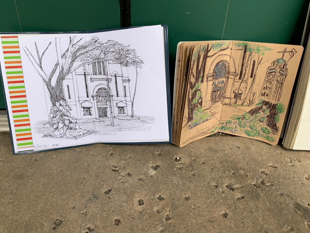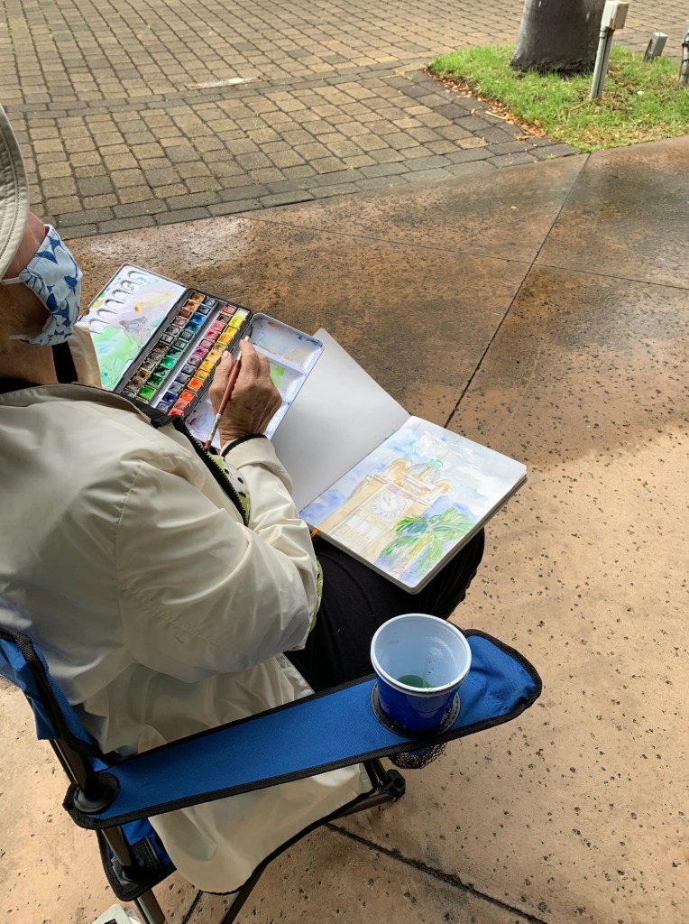 Posted: February 27, 2021 Filed under: USkO | Tags: Aloha Tower, urban sketchers, usk, USkO 2 CommentsThe rain may have dampened our sketchbooks, but not our spirit at today’s Urban Sketchers event at Aloha Tower. Super proud of our little group of O’ahu Urban Sketchers who braved the weather to sketch together.