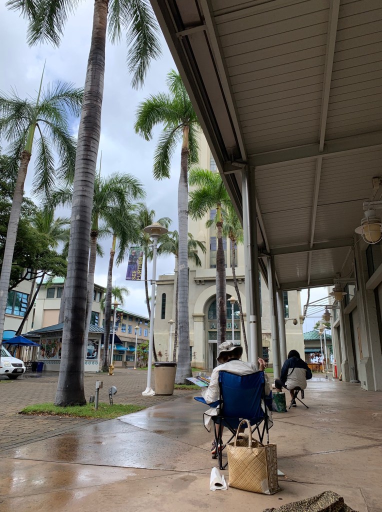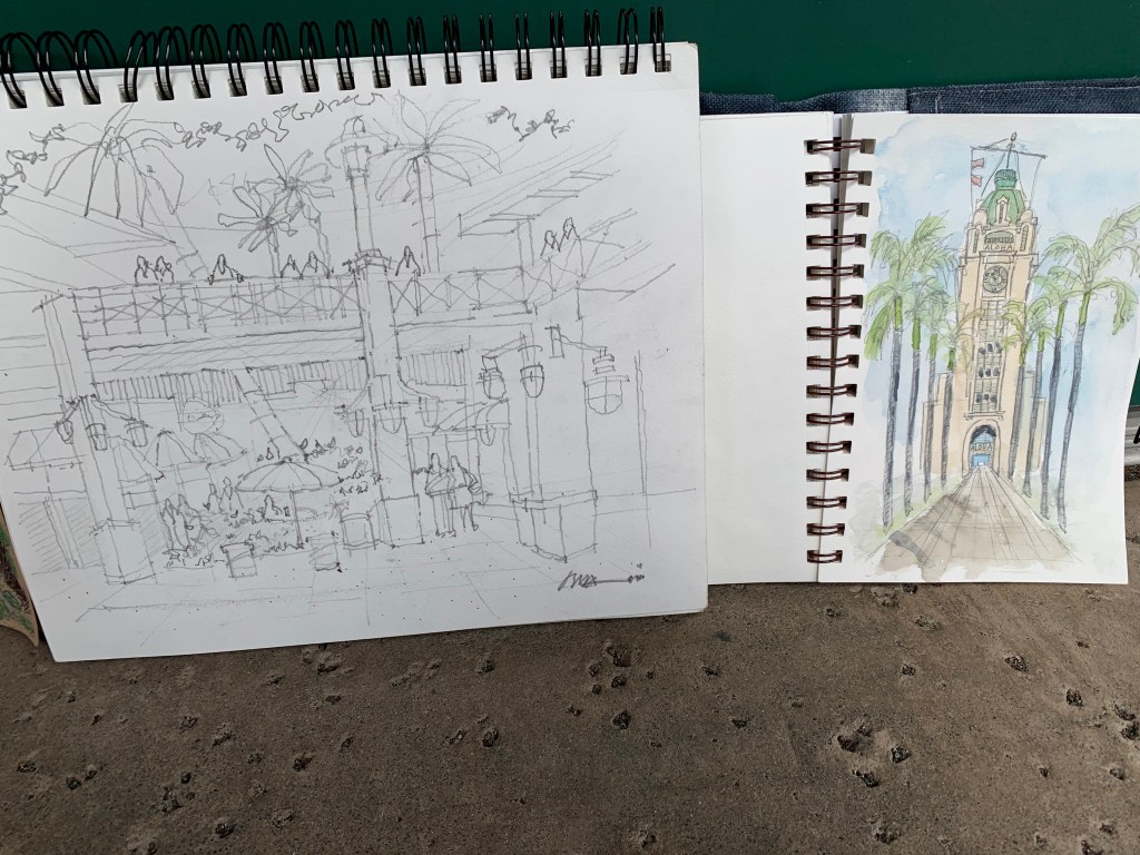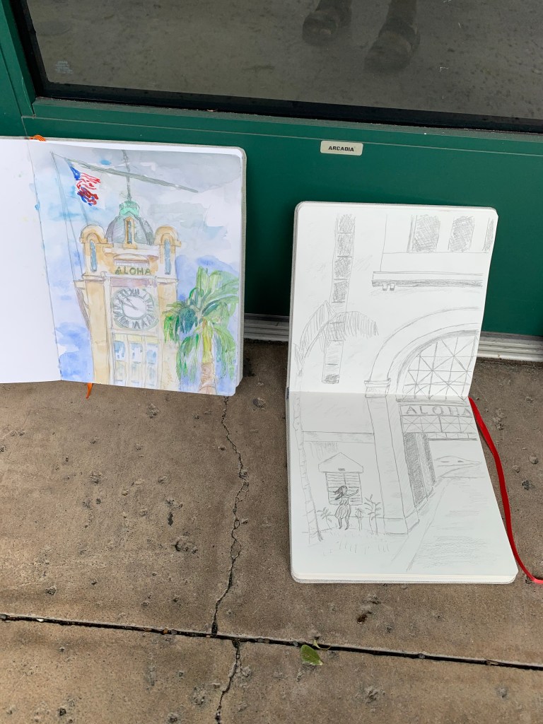 The final historically significant structure we visited was the Aloha Tower. Built in 1926 it originally served as a lighthouse but was decommissioned in the late 1960s and is now being revitalized by Hawaii Pacific University. The view from the observation deck is outstanding. In order not to be in the way (and view) of other visitors to the deck, we decided to sketch the tower and its surroundings from the marketplace.