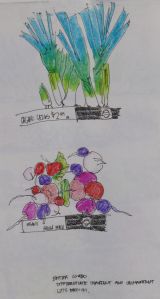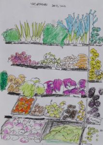 After finishing the first sketch I realized something could be improved. I was using a pen and pack of crayons – outlining basic shapes with my pen and filling in those shapes with bright waxy crayons, thinking that the crayons would nicely accentuate the produce. Instead of limiting the use of crayon to the vegetables though, I got carried away and started filling in the shelves. This counteracted my original intention of making the vegetables stand out. I decided to do two additional close-ups with the refined method – using crayons for the vegetables and crosshatching the shelves with pen. This created the distinction I was looking for.