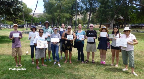 As usual, we gathered for a show-and-tell at the end of the event to share our artwork, techniques, and thoughts on materials. Pen, pencil, watercolor, color pencil, and ink all made an appearance in the artwork on display. Our lively discussion covered a variety of topics ranging from where to buy supplies, through layering of media, to the mesmerizing effect of the zoo cacophony and the contemporaneous zumba performance at the Kapi‘olani Bandstand. Below are a few photos.