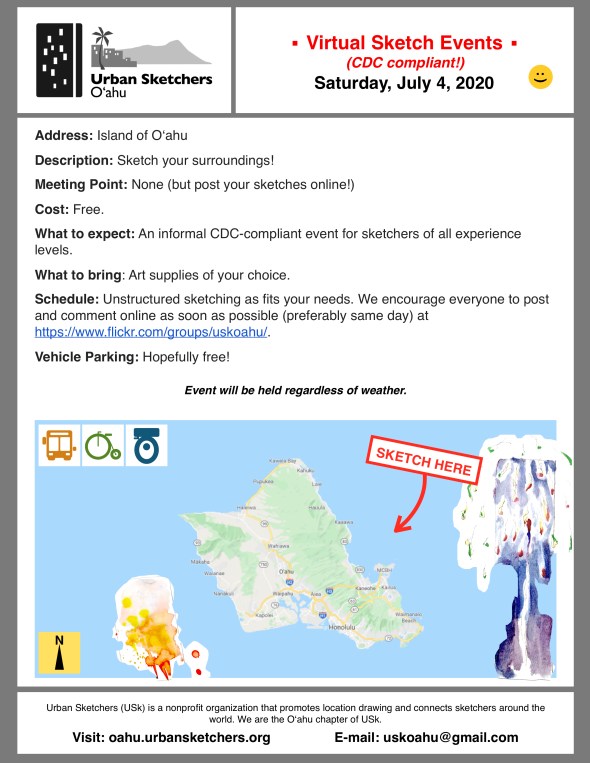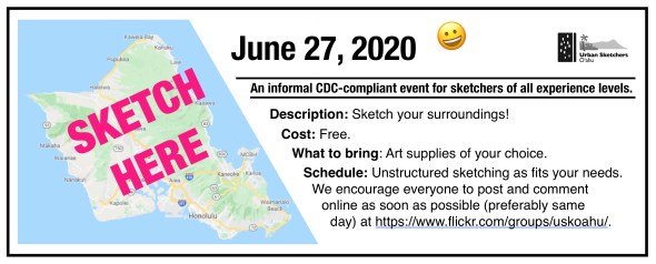 We’ve got another virtual sketching session planned for this Saturday, 8/15/2020. Our theme is for you to use a new media! Now is your chance to explore and experiment! Have fun and be creative with it. As always post your beautiful artwork on Urban Sketchers Oahu’s Group Page on Flickr and also on Instagram using the hashtag #urbansketcheroahu.