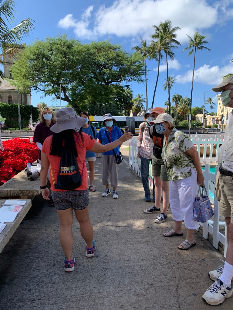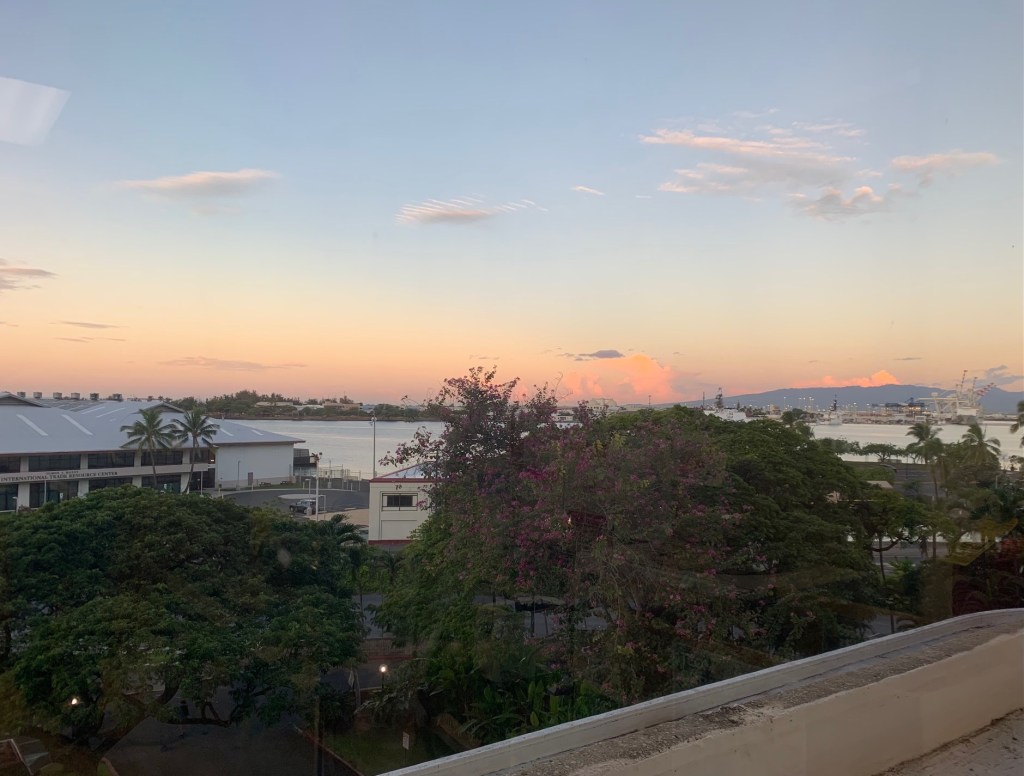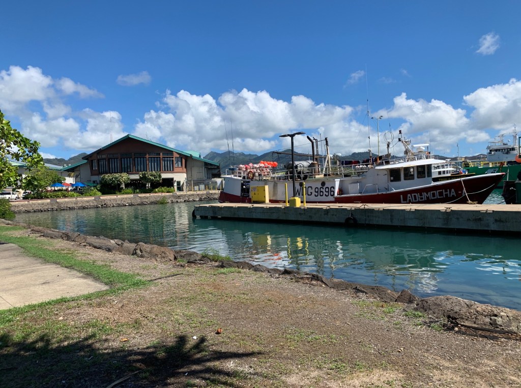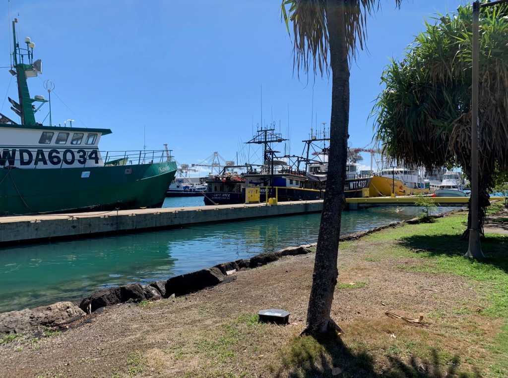 There is ample free parking. But best of all, there are trees lining the pier providing us protection from Honolulu’s mid-day heat. Why is it so hot in November anyway?