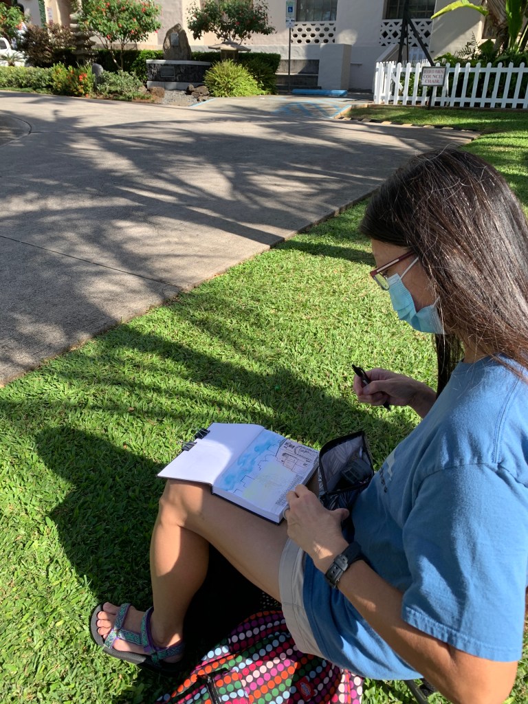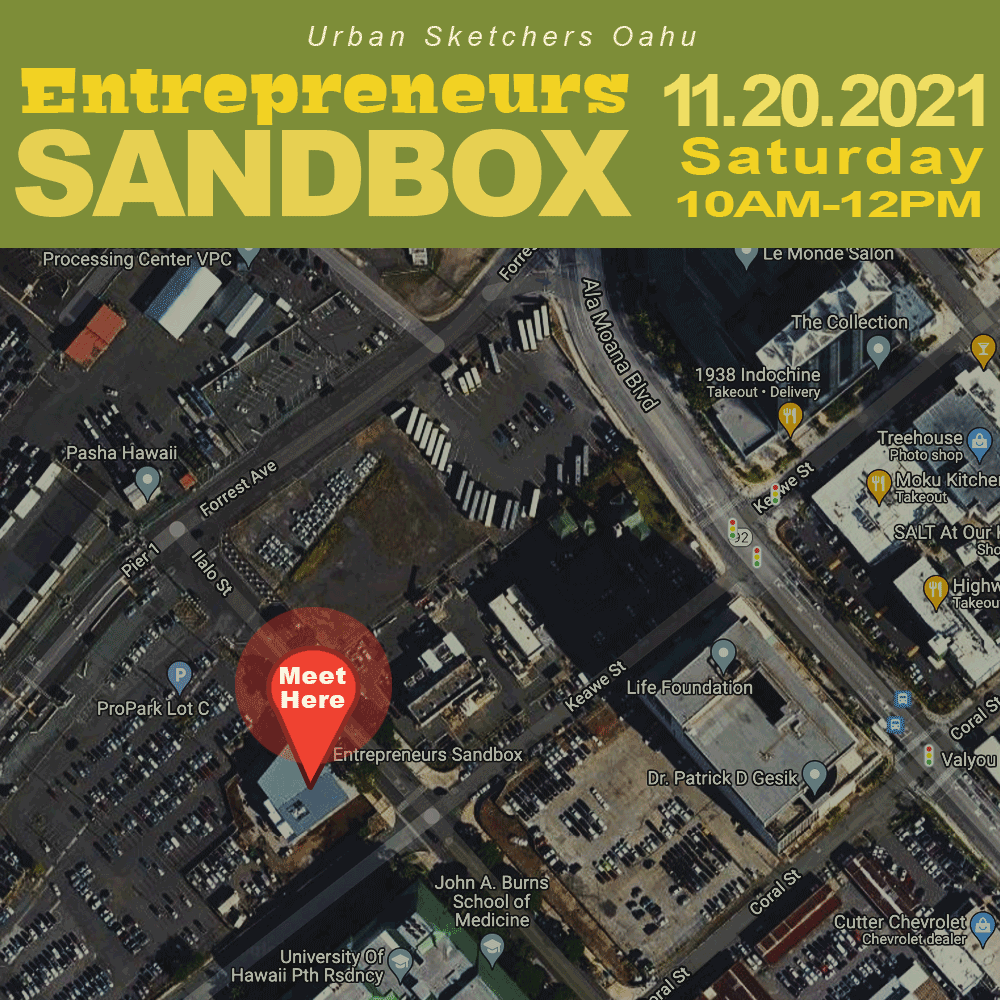 To RSVP, email uskoahu@gmail.com by Friday, November 20th with your name and phone number. It looks like there will be 7 of us so far, so we will break up into 2 groups to be compliant with Oahu’s Tier 2 guidelines. You can also review Urban Sketchers guidelines here.