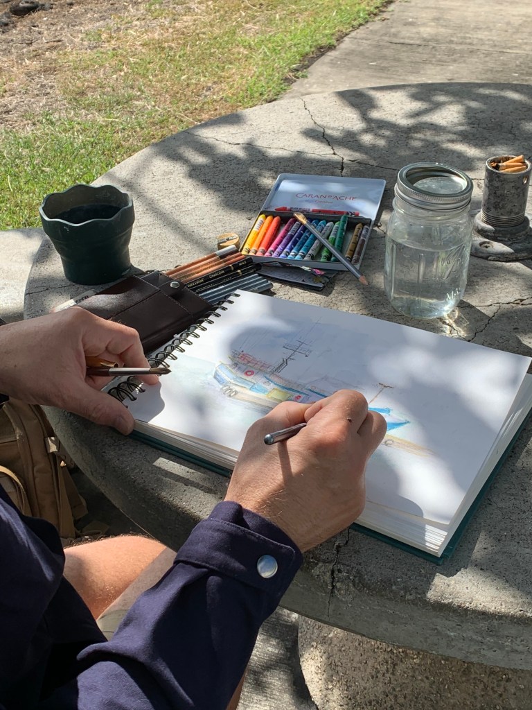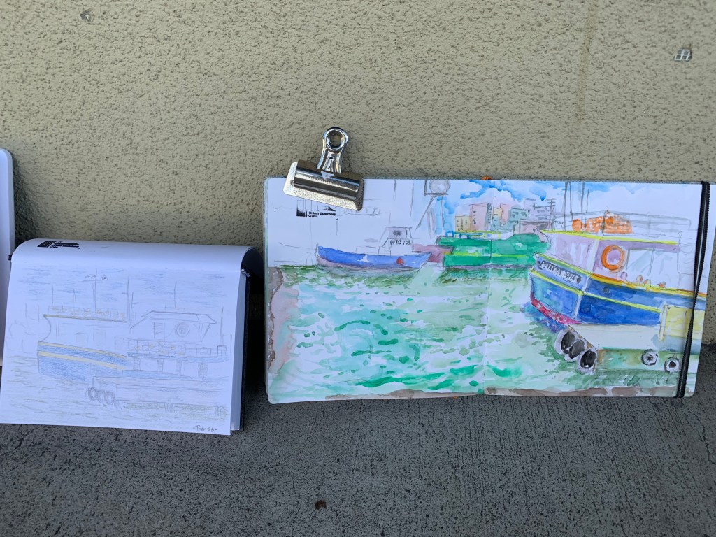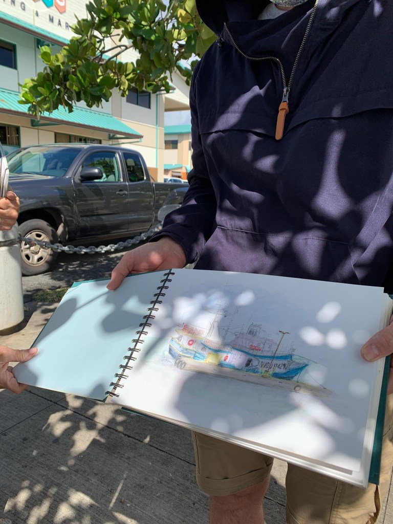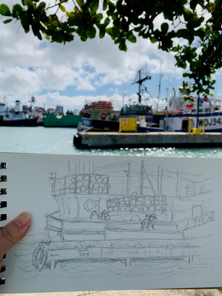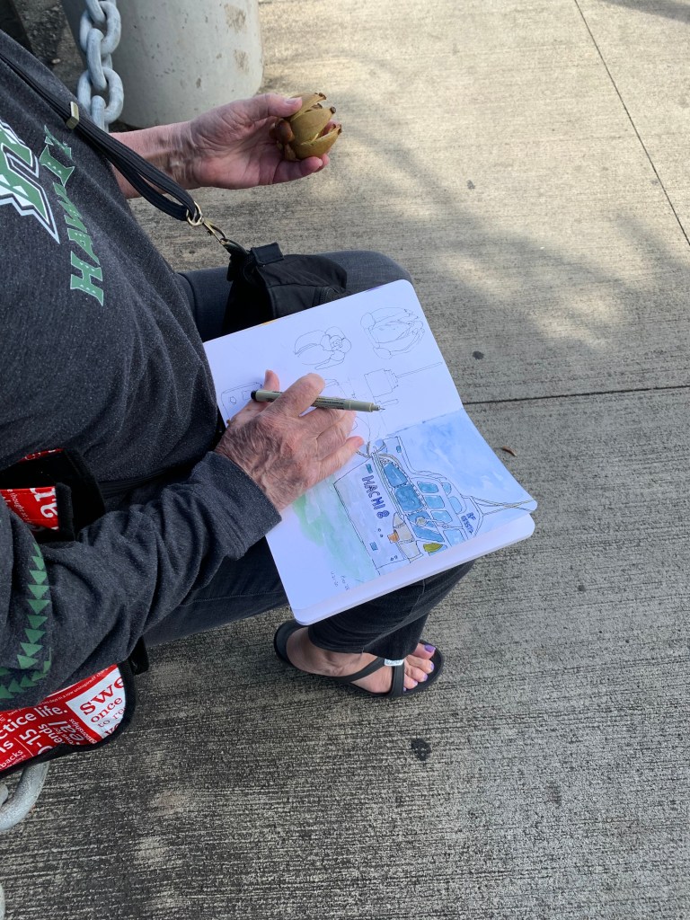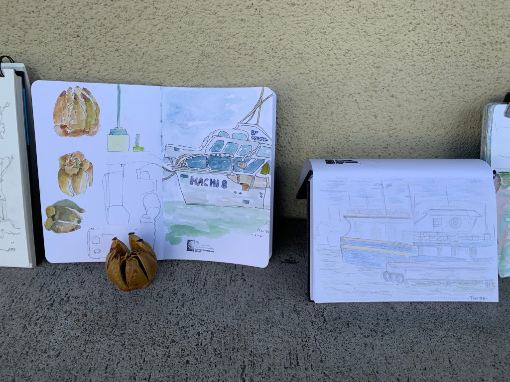 There’s so much to sketch at the harbor: classic fishing boats with fishermen onboard, the ripples of the greenish harbor water, fallen seed pods on the ground, and the large shipping machinery in the distance. Time just flies by when you are trying to focus on your sketch.