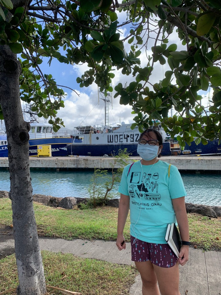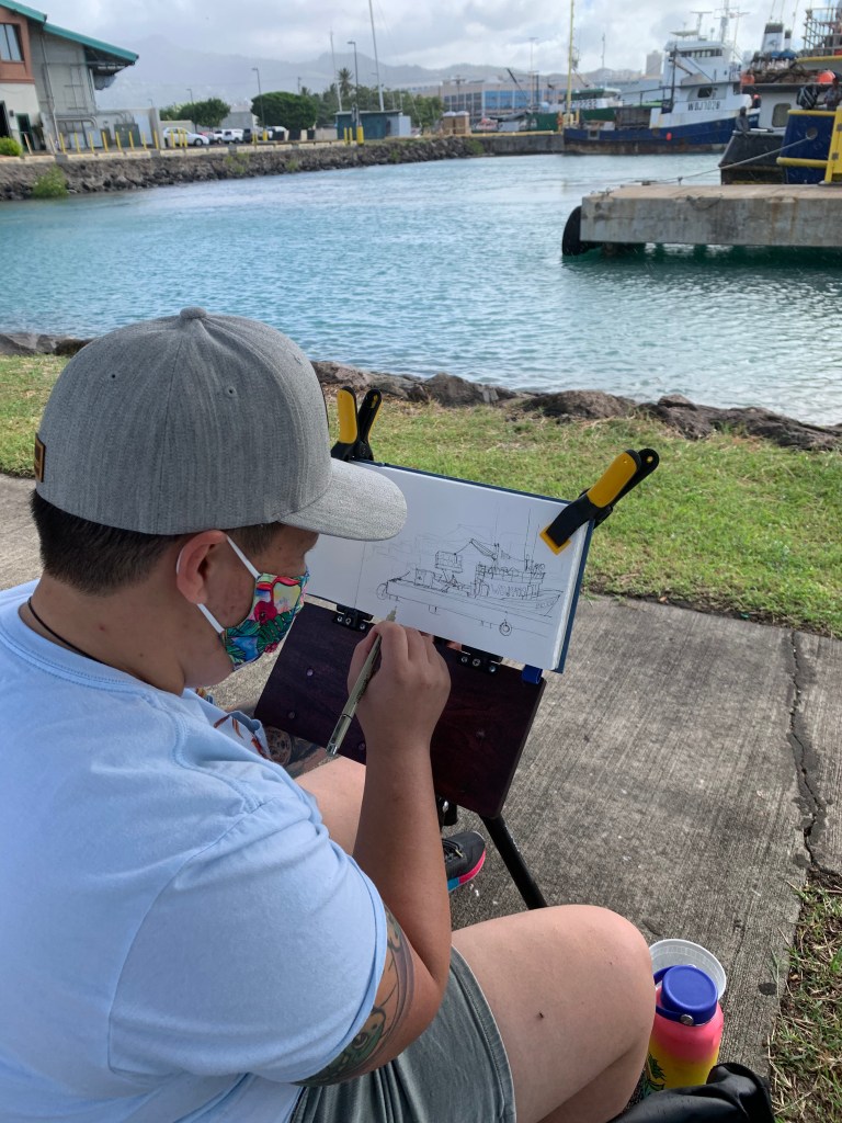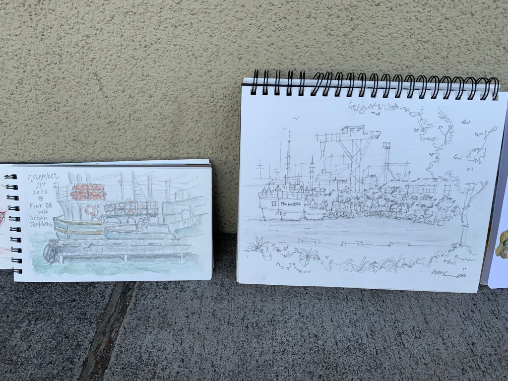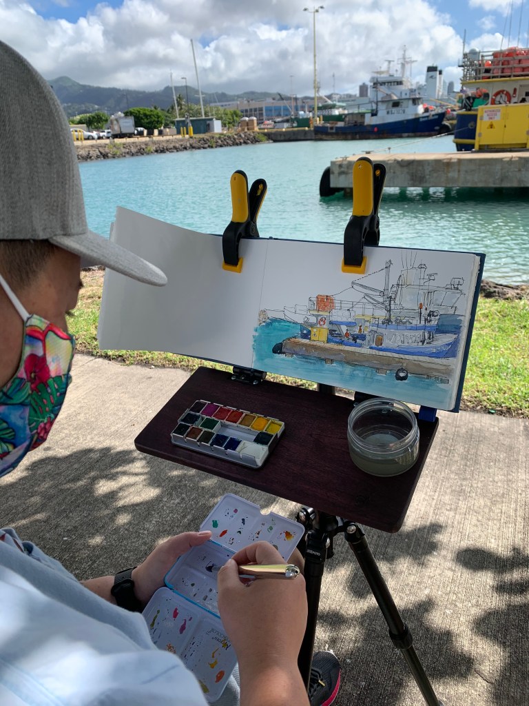 Posted: November 21, 2020 Filed under: USkO | Tags: Honolulu Harbor, urban sketchers, usk, USkO 4 CommentsA little drizzle and a little wind couldn’t stop us from sketching at Pier 38 this morning. What a nice Saturday to be outdoors sketching daily harbor activities.