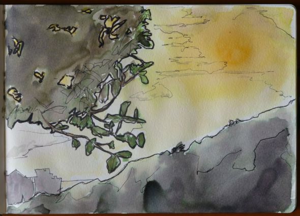 Afterwards, I did a sketch of the sunset. I liked the stark contrast between the bright orange sky and the dark green leaves of the tree in the foreground. Rain clouds were sneaking up behind me so I had to finish the sketch indoors.