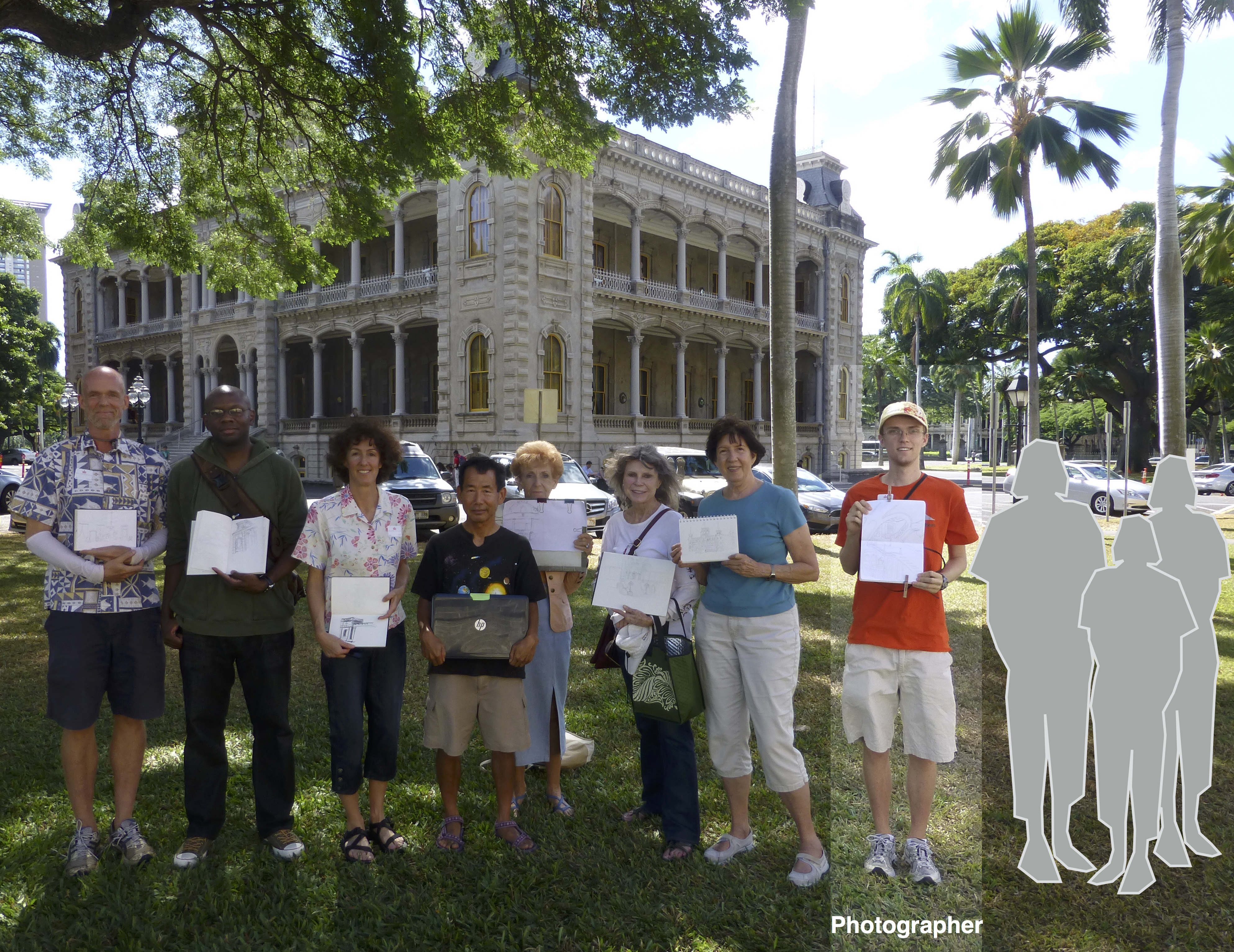 Posted: November 13, 2016 Filed under: USkO | Tags: ‘Iolani Palace Leave a comment‘Iolani Palace is a popular subject for sketchers, but rarely do we get to venture inside with pencil and paper. Today’s opportunity to do so, thanks to the support and hospitality of the Friends of ‘Iolani Palace, was thus greatly appreciated, as was the fascinating tour by docent educator Zita Cup Choy. With exterior views being just as tempting on a beautiful day, time was too short for most of us to cover even a fraction of the many irresistible sights. Yet again, the verdict is: we will be back!