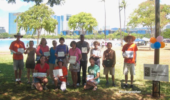 We ended the day with a giveaway of art supplies generously provided by Hawaiian Graphics and an announcement of our new t-shirt – information will be available online soon! The festive mood was further enhanced by treats from Nancy, Susan, and Terri & Bill (mahalo to all!) that fueled an extended post-sketch lunchtime social on this special day.