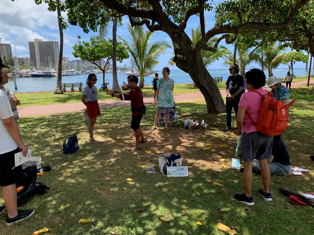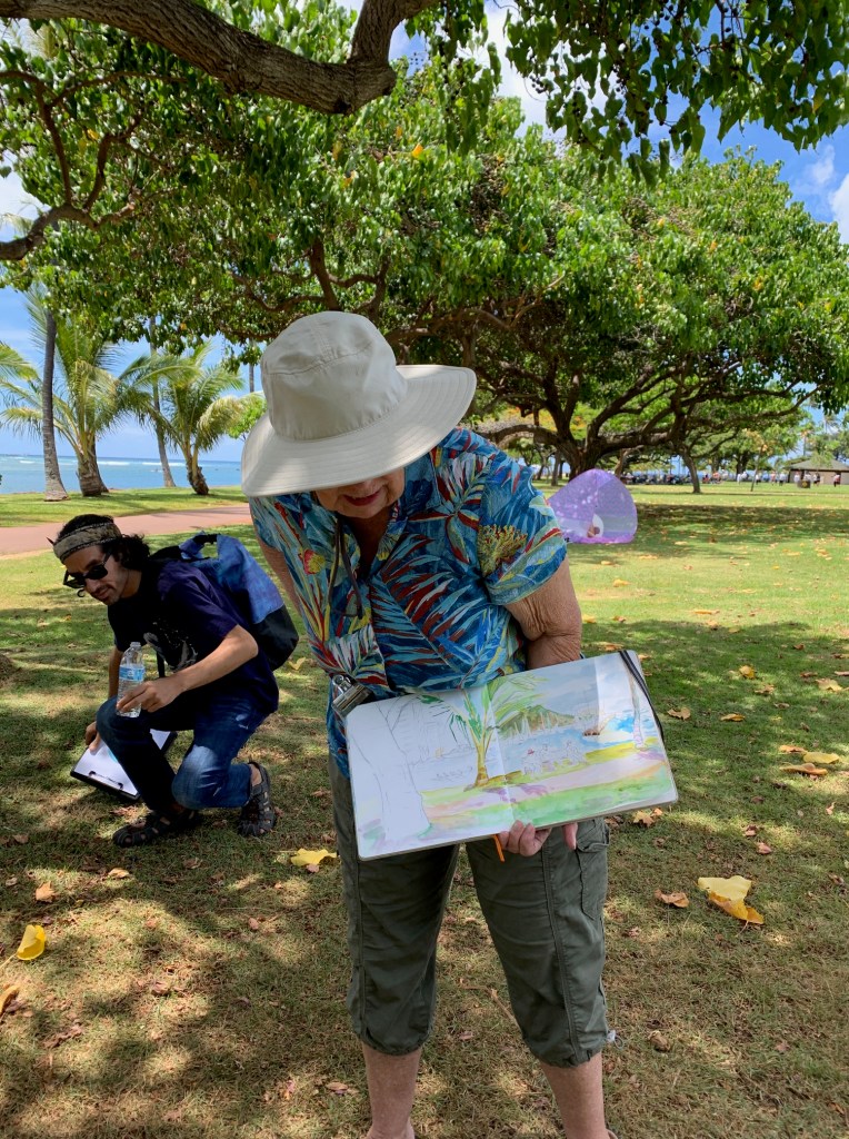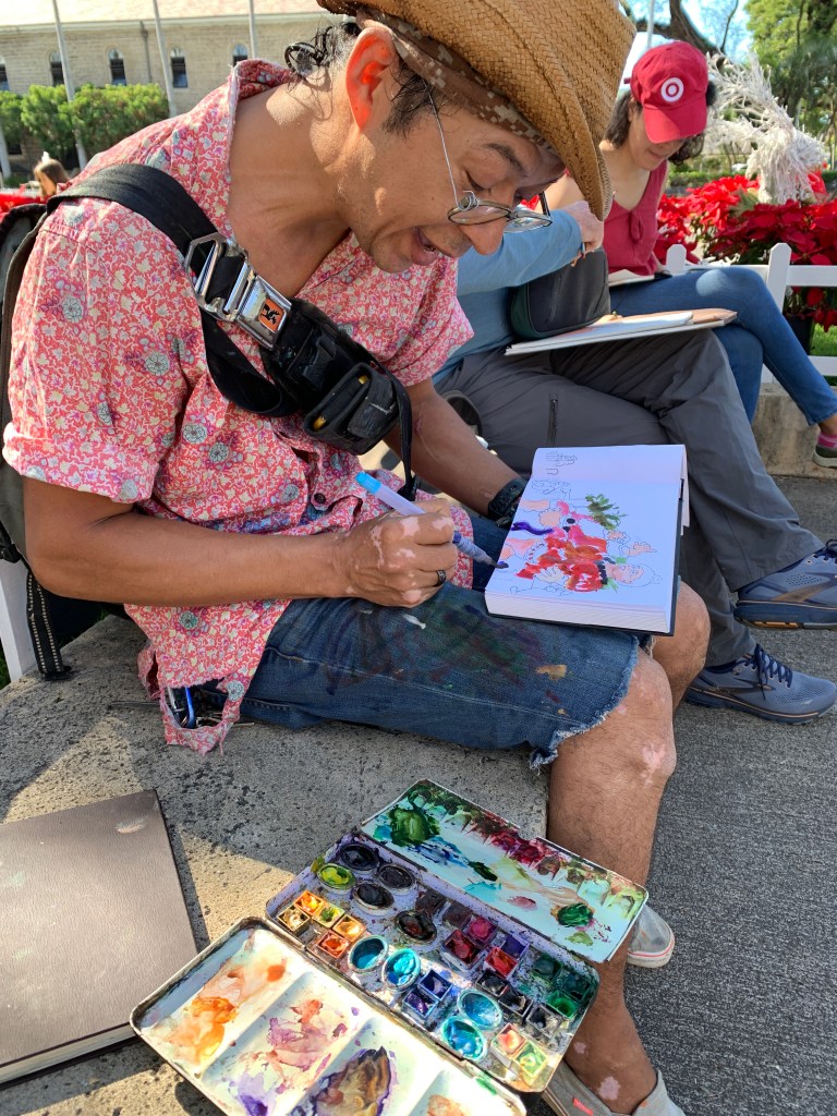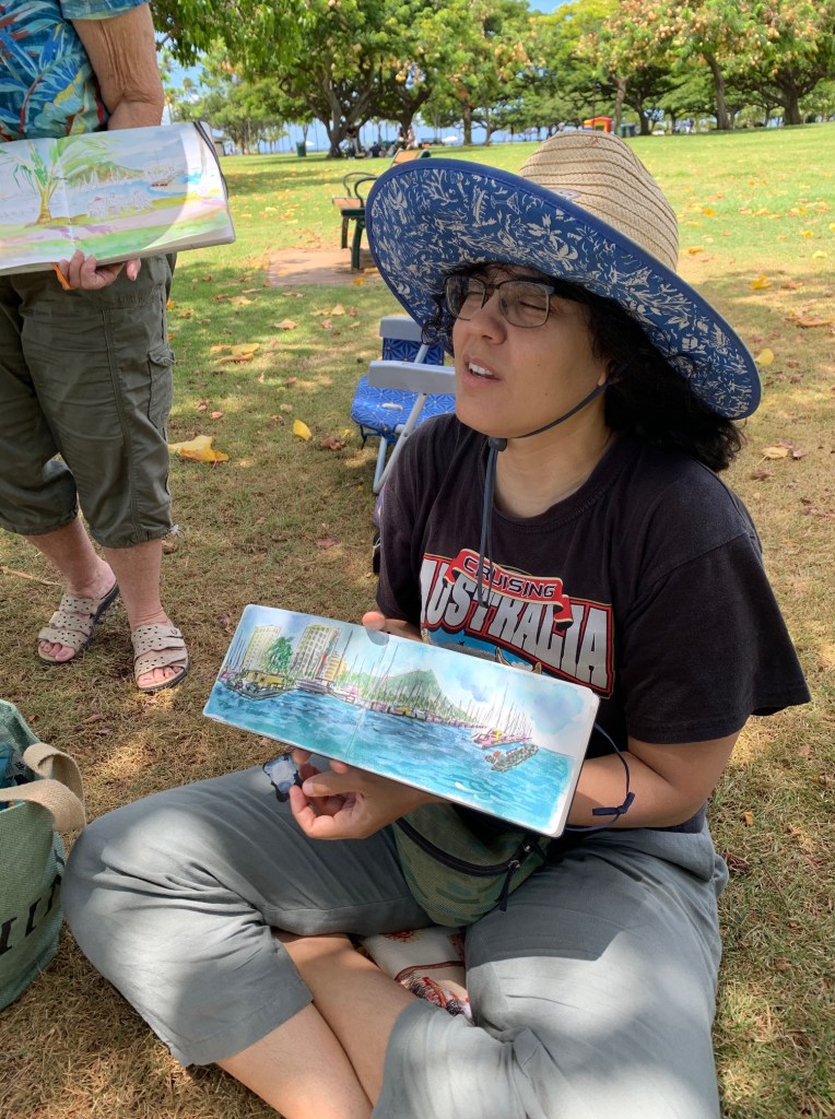 As Urban Sketchers, our mission is to raise the artistic, storytelling of our city by sketching on location, promoting visible art and connecting people. I think we do a pretty good job of capturing a glimpse of Honolulu to share with the world.