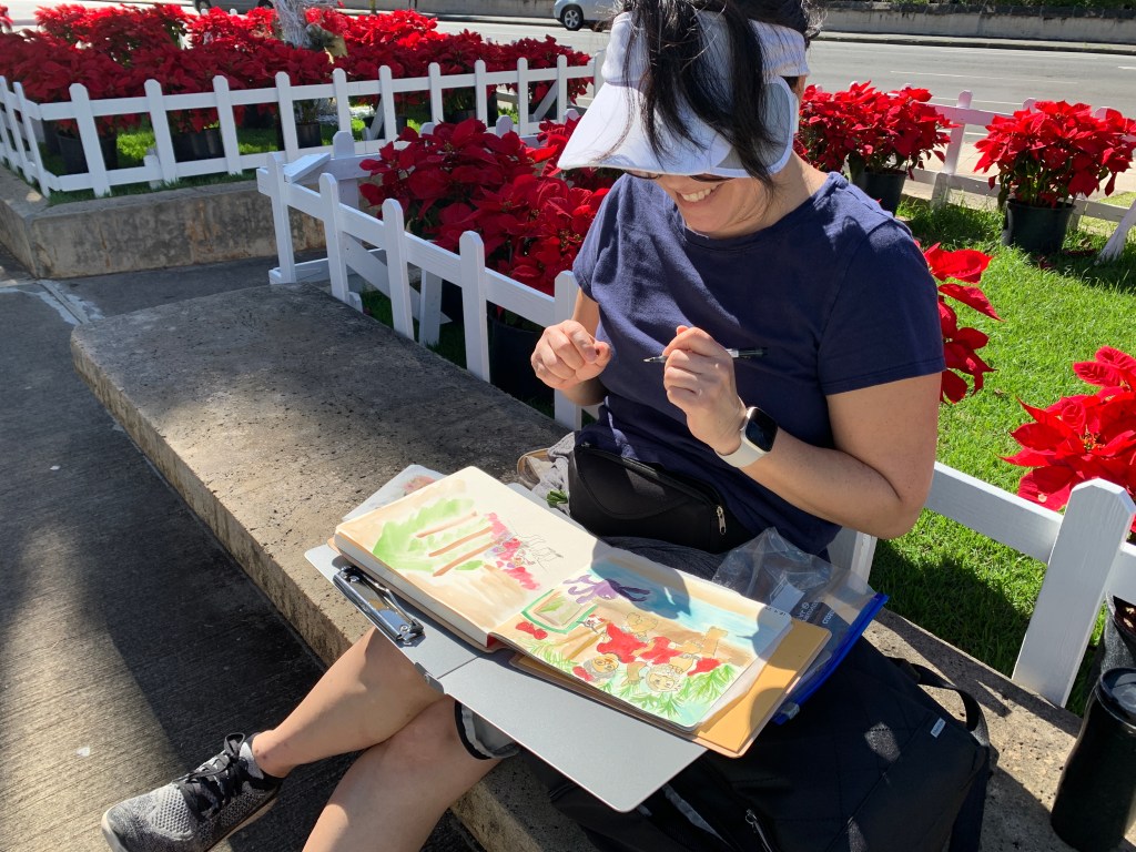 Our next meet up will be Saturday, December 14, 10am to noon at Honolulu Hale. It’s our annual holiday, end-of-the-year place to sketch. Until next time, keep sketching!