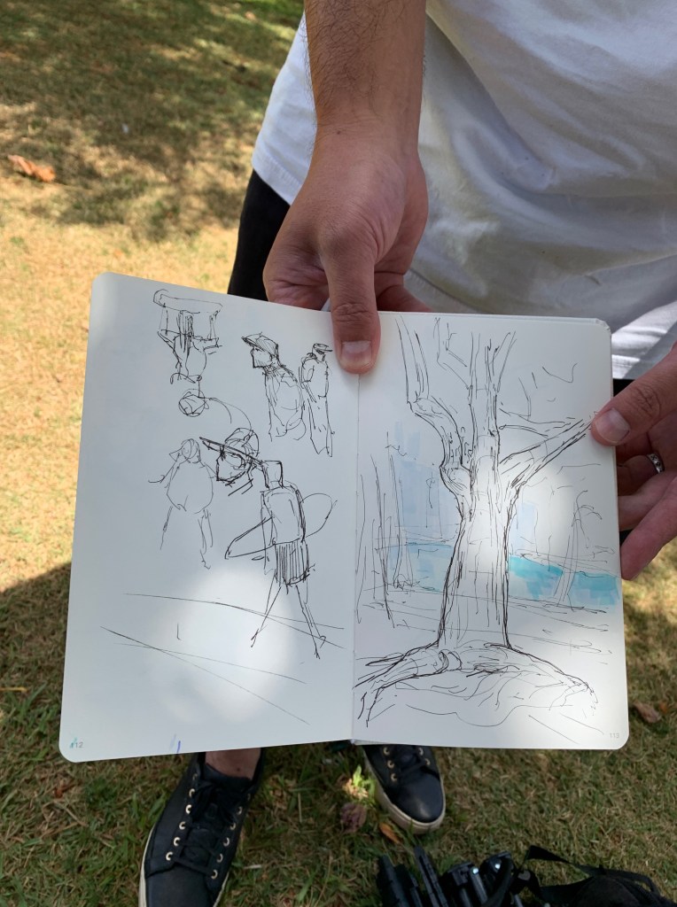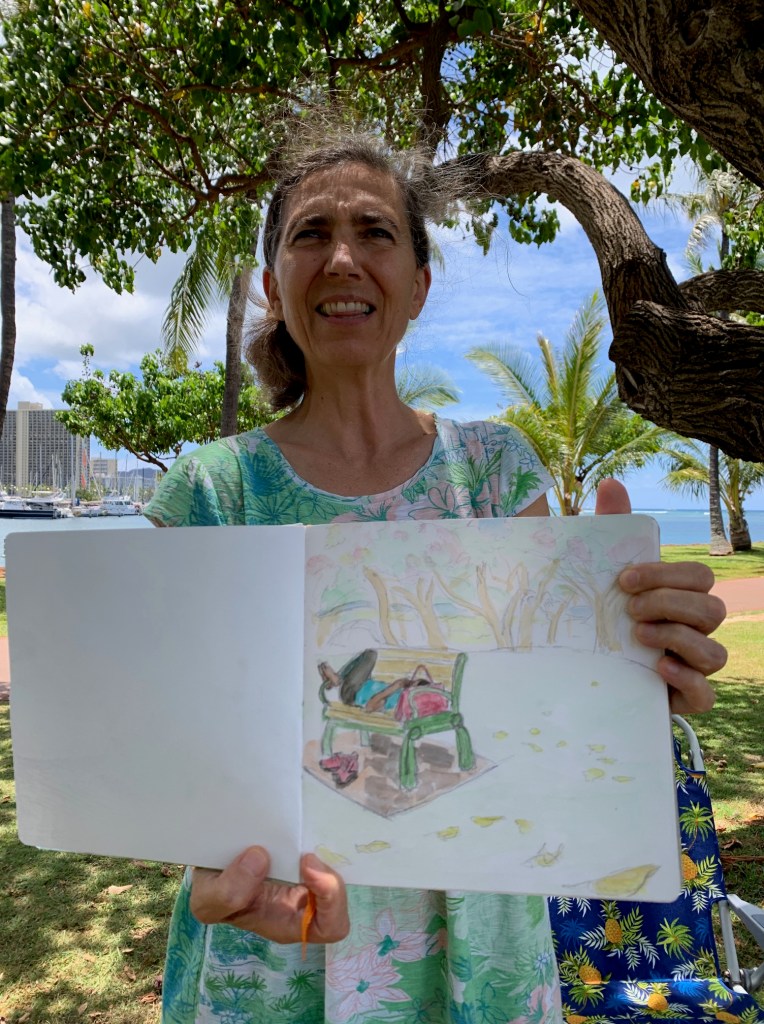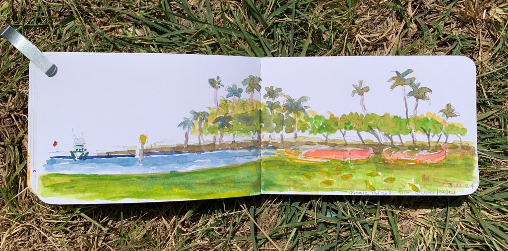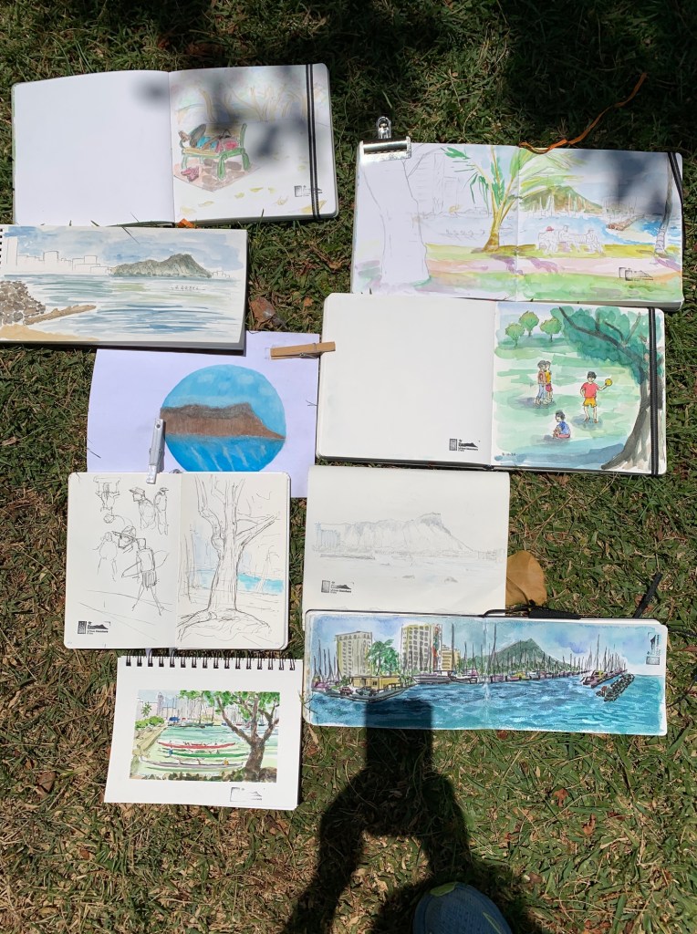 Posted: August 10, 2024 Filed under: USkO | Tags: art, drawing, sketch, sketches, sketching 1 CommentWhat a gorgeous Saturday morning to be sketching at Magic Island with Diamond Head in the background and our sketchbooks in the foreground.