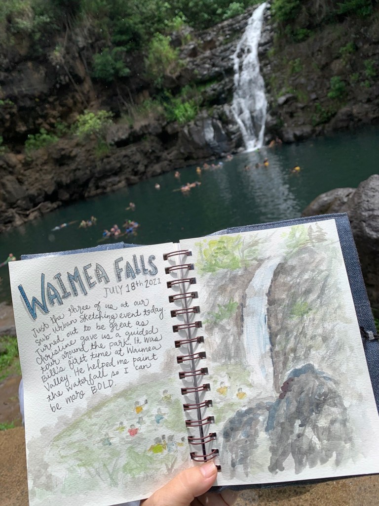 Posted: July 18, 2021 Filed under: USkO | Tags: oahu urban sketchers, urban sketchers, usk, USkO 1 CommentIt was just three of us at Waimea Valley on this rainy Sunday but it was still really enjoyable. We got to leisurely stroll the grounds of the park, mostly alone as the crowd of tourist made a b-line to the waterfall.
