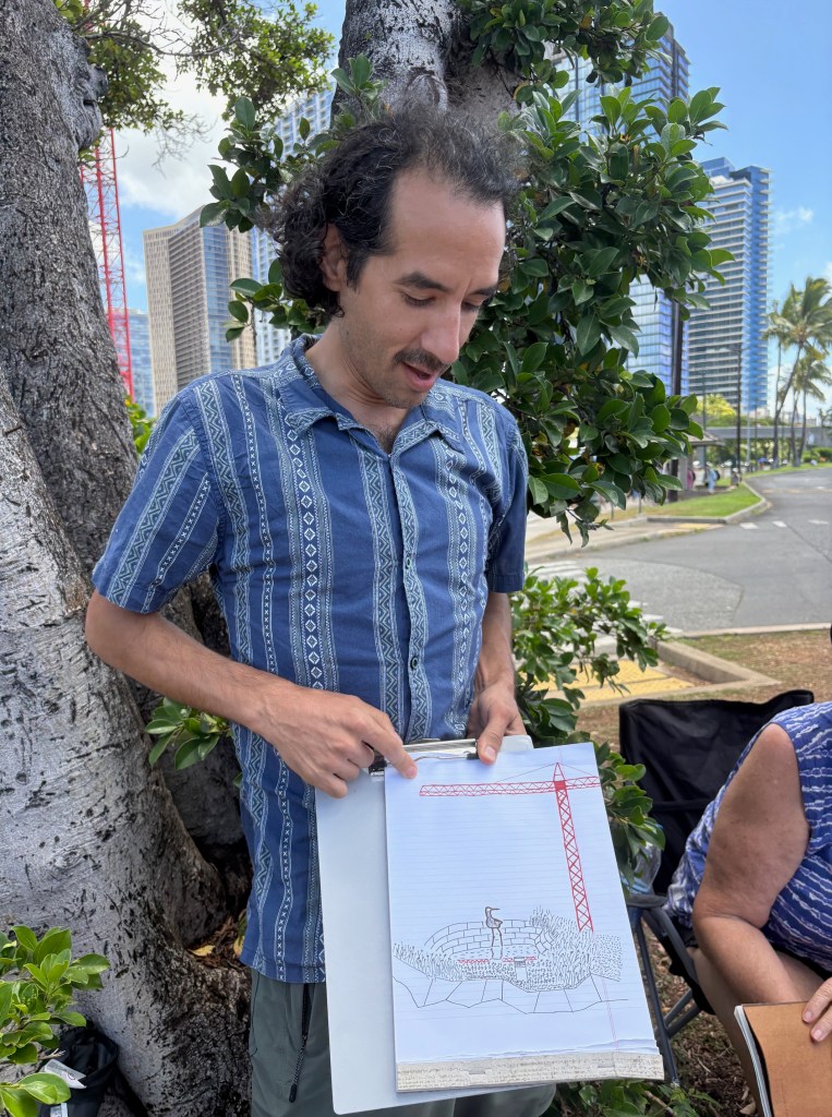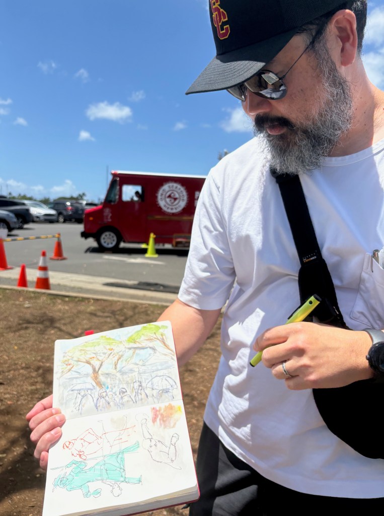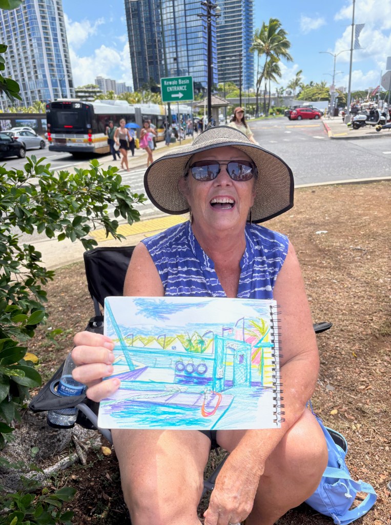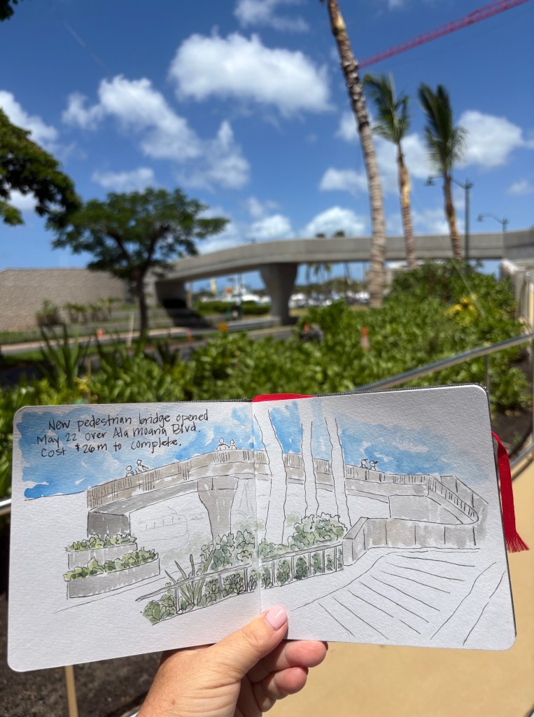 As Urban Sketchers, our mission is to raise the artistic, storytelling of our city by sketching on location, promoting visible art and connecting people. I think we do a pretty good job of capturing a glimpse of Honolulu to share with the world.