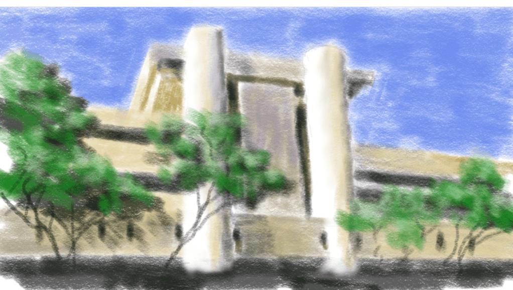 Its massive design commands your attention. As an Urban Sketcher, it is a challenge with its sharp angles and curved features and formal, heavy scale. One Urban Sketcher noticed the lack of windows. It just echoes its serious, formal design. This is a place of authority.