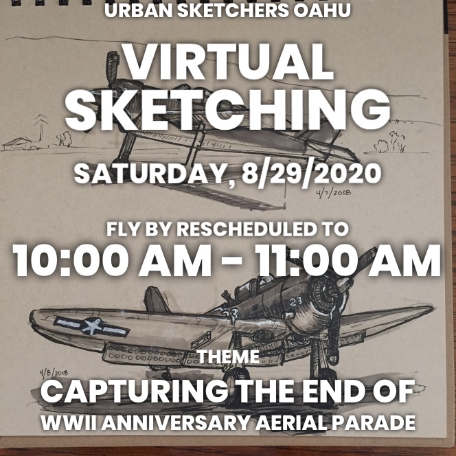 This is an historic commemoration and we on Oahu are privy to witness this special tribute. Wherever you are, sketch what you see in the skies. If possible, position yourself for a grand view of the Legacy of Peace Aerial Parade. Keep in mind all beaches and parks are still closed.