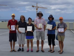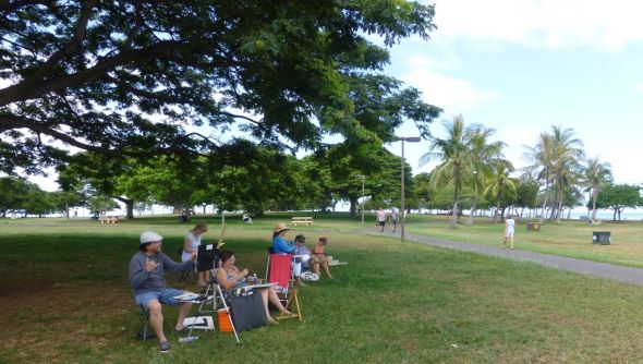 Posted: May 24, 2015 Filed under: USkO | Tags: ala moana, construction, crayons, pen, pencil, shopping mall, watercolor pencils Leave a commentOur chapter held a sketch event this Sunday morning at Ala Moana Shopping Center. It was good to see a few returning sketchers, as well as newcomer Mayumi. The weather was great – occasionally overcast and breezy. From the top level of the parking garage we had a view of the shopping center in front of Ala Moana Beach and downtown Honolulu with the Ko’olau Range as a backdrop. Although chosen for just that reason, our location proved almost overwhelming due to the plethora and detail of targets. It was a challenge not only to pick a scene, but also to distill it while truthfully depicting the subject. This is a location with so much potential that we will have to return someday.