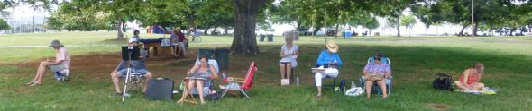 We jumped in at 9:30 and were yet again surprised by how quickly 11:00 arrived – time for show-and-tell. Pencil, pen, watercolor, crayon, and watercolor pencils all made an appearance. Given the similar subjects we chose (e.g., cranes, the shopping mall with scaffolding, and downtown Honolulu), it was interesting to see how differently the challenges of perspective, depth, and contrast were tackled. I came away with a greater interest in crosshatching and a desire to explore the technique more in my own sketches.