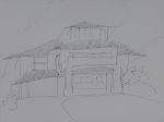 I started a sketch in pen (TÜL GL1 – black, medium on Pentalic 65 lb, 8″ x 5.5″ paper for dry media) and realized that the perspective and scale were wrong; I had a big challenge on my hands. My attitude evolved to one of making lemonade out of lemons though … and I decided to consider my first attempt as a “test sketch” to see how the scene would fit on one landscape-oriented page.