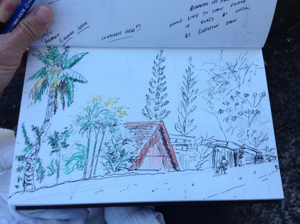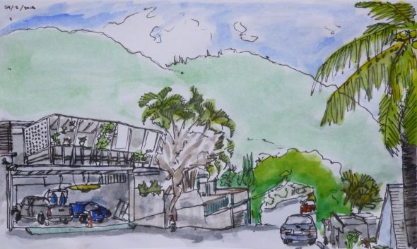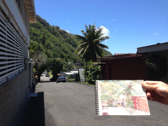 Posted: April 14, 2015 Filed under: USkO | Tags: neighborhood, pen, pencil, watercolor, watercolor pencils 2 CommentsAJ: As mentioned in my last entry, my goals were to ignore my status as a beginner, avoid getting overwhelmed / frustrated by the detail in front of me, and practise without reservation. On this beautiful morning in Honolulu we scouted out an interesting section of a neighborhood. It was a pleasant mix of natural (vegetation) and unnatural (manmade) elements.
